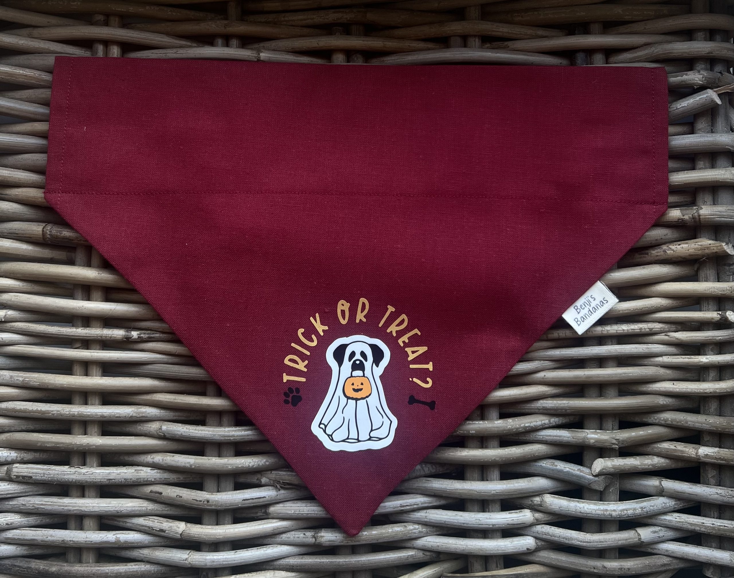 Get your pup ready for a night of spooky fun with this festive “Trick or Treat” dog bandana!